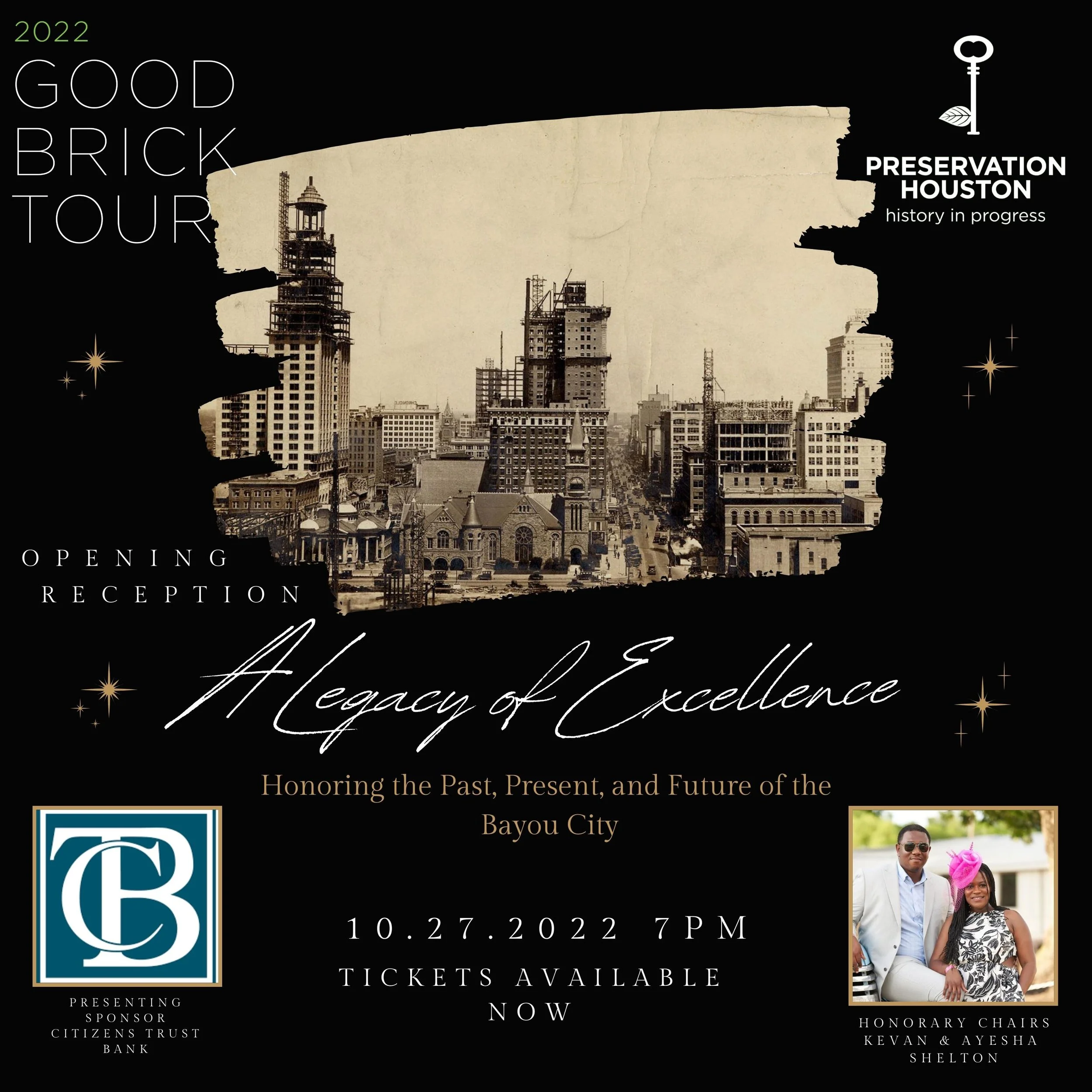Explore the rich cultural and architectural heritage of the Bayou City through some of its most iconic homes and buildings. The opening reception will highlight the 2022 Good Brick Tour and Preservation Houston's efforts to celebrate and protect historic properties in communities of color.