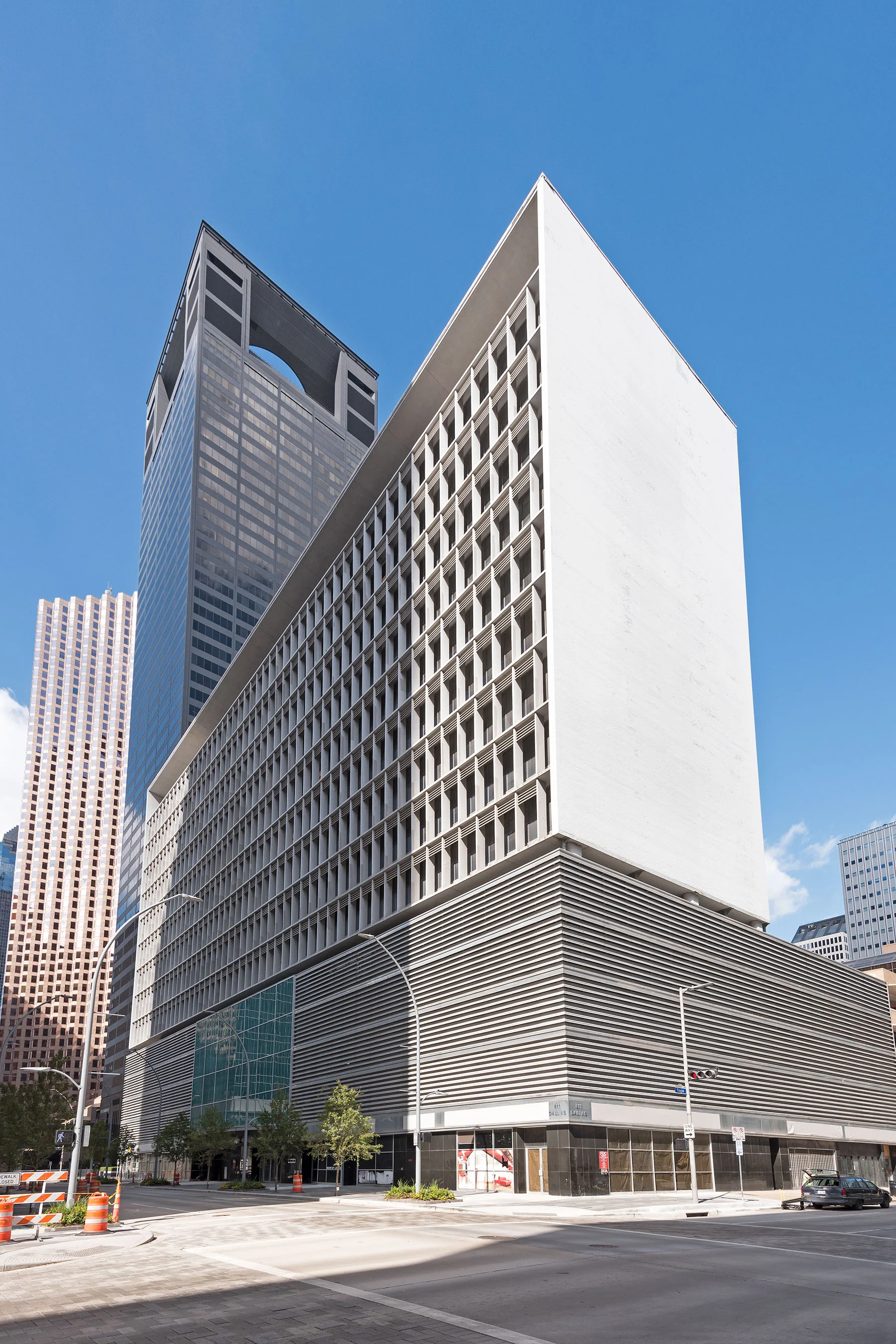 The Chronicle also reports that Hilcorp Ventures will demolish the office tower section of the Americana Building (right) at 811 Dallas Avenue downtown while retaining the building's parking-garage base. Local firm Lloyd & Morgan designed the base of the building in 1957 and added the ten-story office tower in 1961. The Americana was one of the first modernist office towers downtown; the series of fins and louvers shielding its glass south façade from the sun was an early example of the type of sun shading found on many Houston buildings constructed in the 1960s and '70s.