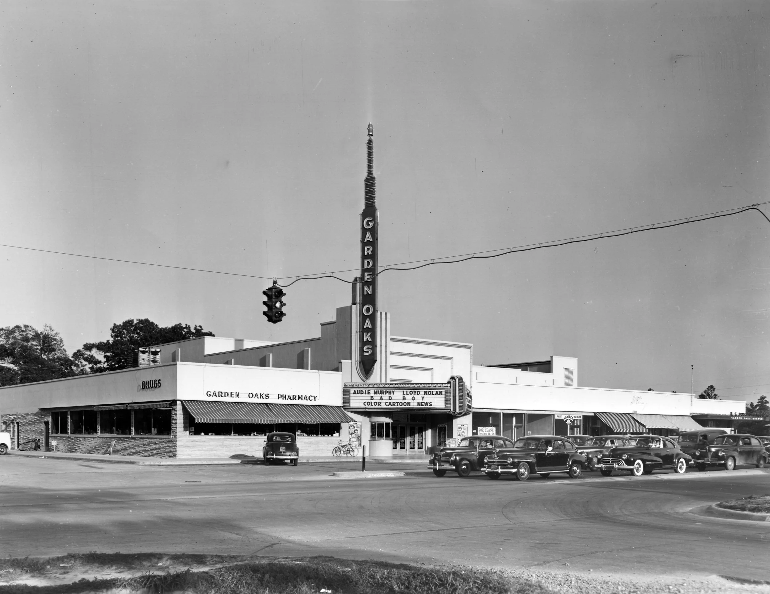 The Garden Oaks Theater at 3750 North Shepherd Drive opened July 10, 1947, as a neighborhood cinema developed by Interstate Theatres. Designed by Pettigrew & Worley, the 783-seat theater served as a 28-day sub-run house and quickly became a visual anchor along the North Shepherd corridor.